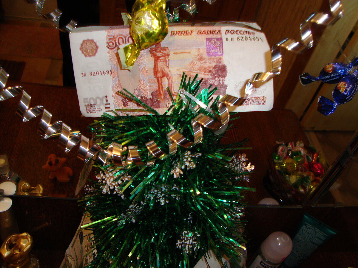 Для украшения вашего стола в офисе или дома можно изготовить елку из мишуры и бумаги. Причем быстро и без затрат! Ёлка может быть абсолютно любого размера- всё зависит от вашего желания. Мишуру также можно использовать разную по цвету, размеру и длине. Последовательность изготовления ёлки следующая: 1. Лист бумаги сворачиваем таким образом, чтобы получился кулёк. Вверху лист либо приклеивается, либо скрепляется (степлером, скрепкой, скотчем и т. д.). См. Фото 2.После того, как верхушку закрепили, необходимо из «кулечка» изготовить конус, т. е. ножницами обрезаем внизу бумагу так, чтобы конус стоял устойчиво. Внизу бумагу подклеиваем или закрепляем скрепкой. См. Фото 3. Мишуру необходимо наматывать на конус снизу, закрепив предварительно за стенку конуса. 4. Виток за витком и ёлка готова! 5. Готовую ёлку можно украсить денежными знаками. И в вашем доме будут и финансы, и хорошее настроение! С наступающим новым годом!