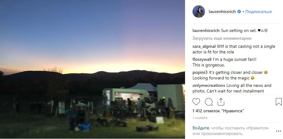 Сценарист Лорен Шмидт (Lauren S. Hissrich) предоставила новое изображение в Instagram, которое дает нам представление о том, как выглядит съемочная площадка сериала "Ведьмак", который мы все так ждём Фотография немного размыта и похоже, что она сделана прямо во время заката. Но мы все еще можем увидеть несколько второстепенных деталей на изображении, которое вы можете увидеть ниже. Всё размыто, но все же, кажется, что съёмки продолжаются. Вообще фотографии со съёмок немногочисленны. Здесь мы можем видеть ещё одну локацию съёмок По всей видимости, появившиеся в Твиттере фотографии сделал один из участников массовки, на одном из снимков закрыв своё лицо смайликом :-) . Проказник)) Помимо декораций и одежды на фото можно увидеть солдата с щитом, на котором, вероятно, изображён герб Цинтры Другие фото Lauren S. Hissrich (взяты мною с ее инстаграм) со съёмок «Ведьмак» в настоящее время не имеет даты выпуска, но ожидается, что он дебютирует на Netflix в конце 2019 года. Посмотреть
