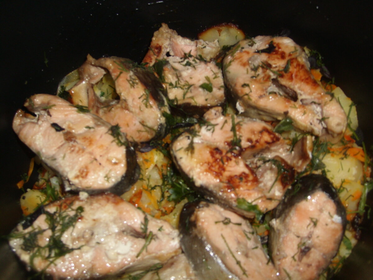 Когда сын подарил мне на 8е марта мультиварку, я была очень рада. Сразу стала экспериментировать. Сначала методом тыка, проб и ошибок нашла ко всему свой режим. например суп я варю на режиме "тушение", пельмени на режиме "плов", да, да именно пельмени, они не развариваются и получаются очень вкусными. Мультиварку ставлю на разогрев, кладу столовую ложку сливочного масла, затем засыпаю пельмени, заливаю кипятком, буквально на 3 пальца выше пельменей, не забудьте сразу помешать, много воды не надо, 15 минут и пельмени готовы! Кстати у меня есть очень хороший рецепт теста для пельменей и не только, что б не разваривались,но это по позже. Сегодня хочу поделиться рецептом приготовления в мультиварке красной рыбы с картошкой. У меня мультиварка ПОЛАРИС 0512. Горбушу порезать на кусочки, посолить, поперчить.полить лимонным соком, дать настояться. Картошку чистим, режем кольцами. Лук режем полукольцами, морковь натираем на крупной терке. В мультиварку наливаем 2ст. ложки подсолнечного масла