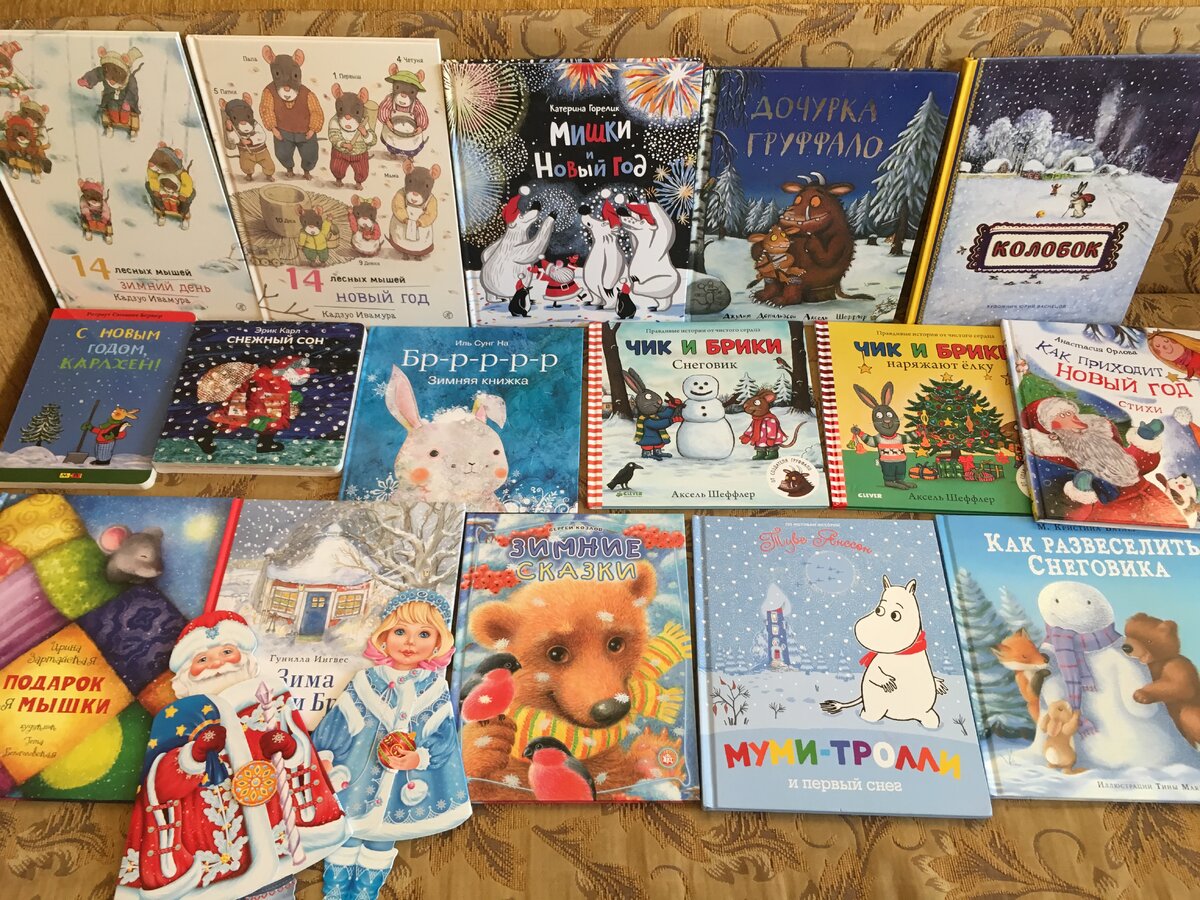В этом году вышло огромное количество новогодних книг, которых у нас нет. Потому что очень много новинок на 3-4 года, что не по возрасту обеим дочкам (старшей 5.5, младшей 1.1). Ну и просто у нас много тематических книг, поэтому решила не злоупотреблять. Покажу наши старенькие зимние и новогодние книги, плюс немного новинок. Мы с Ритой начали читать Дедморозовку (книжка отличная!), но пока прервались на Буратино, потому что новогодний утренник будет именно по этой сказке. В 5.5 лет «Золотой ключик» заходит как по маслу.