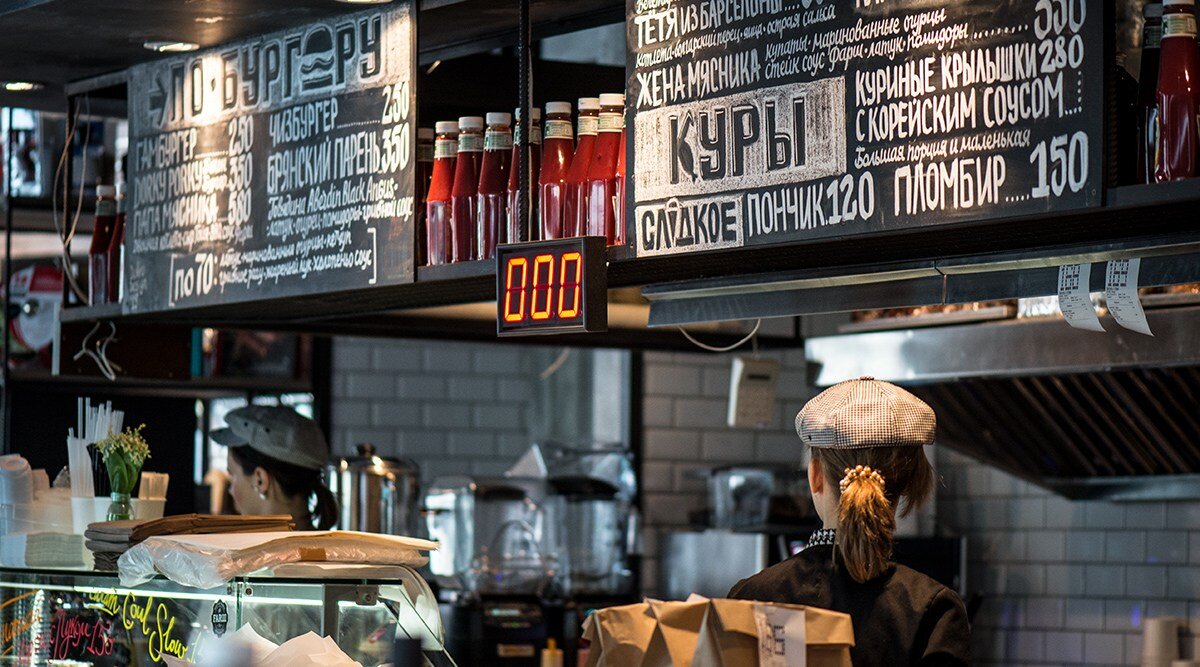 Можно, например, установить по залу меловые доски на мольбертах с заманчивыми предложениями. При этом открытая выкладка товара со своими пряными запахами или хрустящим хлебом манит все это попробовать. Задача была сделать навигационные доски со своим характером: у кого-то в меню хумус с намеком на восточную письменность, у других — «плавучие» буквы с ассоциациями на морепродукты, у третьих — это сдержанный узкий шрифт для передачи настроения американского меню с мясом на гриле.