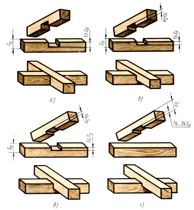 Соединение брусьев или бревен можно встретить при возведении стен или в верхней или нижней обвязке в каркасных домах. К основным видам соединений можно отнести вполдерева, вполулапу, шиповое и угловой сковороднем. Врубкой вполдерева считается вырубка или срезка половины толщины на концах брусьев, после чего они соединяются под углом в 90 градусов - vk.com/wall-72891995_782 . Соединение вполулапа образуется при зарезке на концах брусьев наклонных плоскостей, благодаря которым брусья плотно соединяются. Размер наклона определяется по формуле. Врубка угловым сковороднем очень похожа на врубку вполдерева, но отличительной чертой является то, что при таком соединении один из брусьев теряет небольшую часть в ширине.