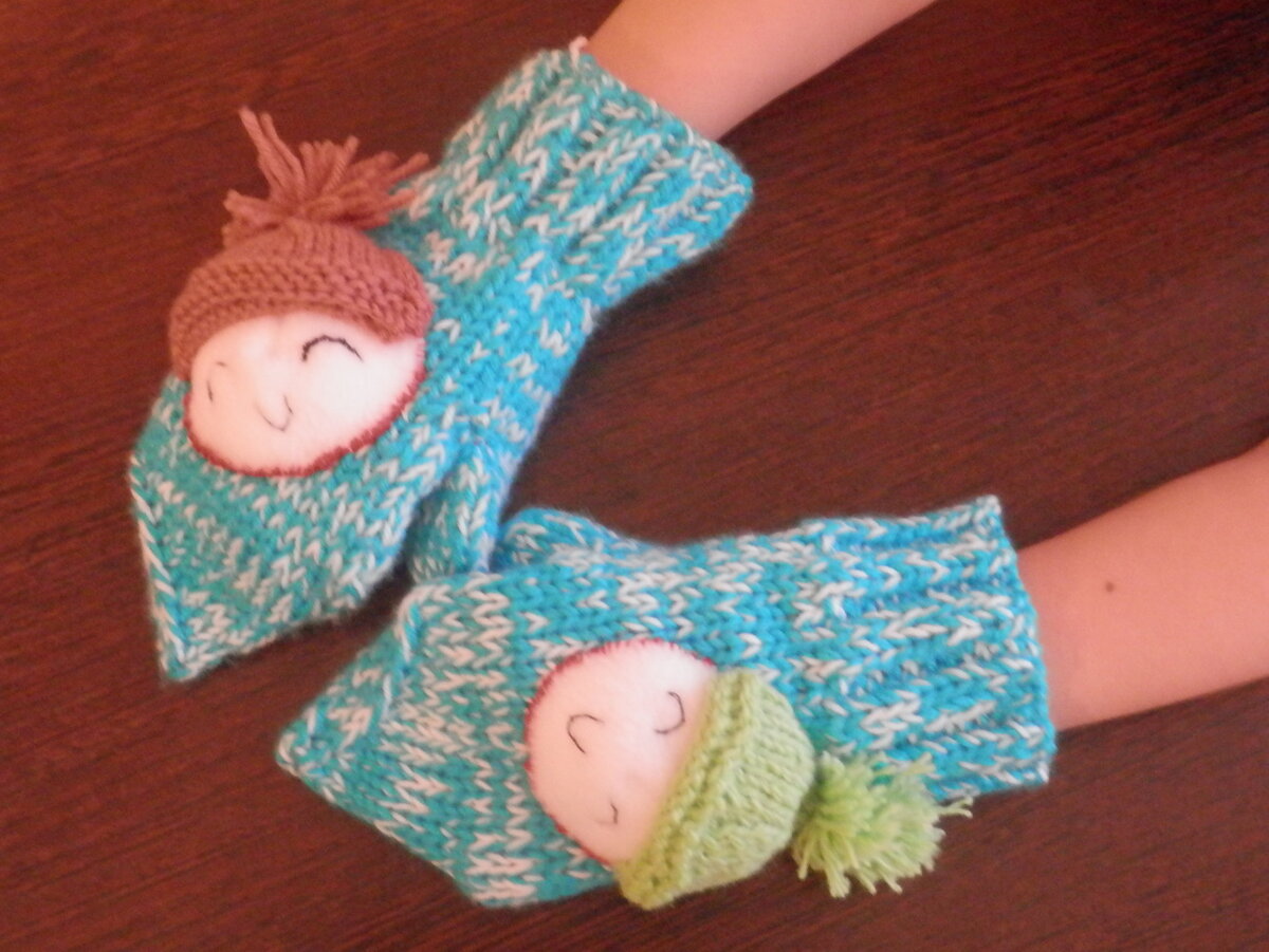 Эти веселые варежки спицами даже юная мастерица сделает за несколько часов. В работе нужны три спицы и вязать варежки этим способом удобно и быстро. Небольшой совет любимым маленьким модникам и модницам. К варежкам можно подобрать в тон шапку и шарф. Можно связать из аналогичной пряжи уникальные изделия, которые дополнят варежки. Гетры, также связанные спицами, могут послужить дополнительным аксессуаром к готовому ансамблю. Для работы потребуется: - пряжа "Детская пехорка" 2 мотка (белый и голубой); - спицы чулочные 3 штуки; - нить голубая, иголка; - крючок. Для украшения шапки: - вата; - пряжа (фиолетовая, зеленая); - фетр (белый); - нить черная и красная; - иголка. Удобные схемы помогут сделать эти варежки быстрее. 1. Этап: резинка Набрали 40 петель. Варежки для зимы и поэтому в три нити. Две голубые и одна белая. Резинкой 2 на 2 начать сразу после набора. Распределить петли на две спицы по 20 петель. Вязать на трех спицах. По рисунку сделать 10 рядов резинки. 2. Этап: основа в