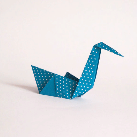 6 Сложите модель пополам вертикально (горная складка для создания левой и правой стороны лебедя). Поверните на четверть оборота. 7 Осторожно вытяните шею и голову лебедя оригами . 8 Все готово.