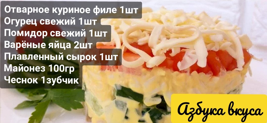 Приветствую Вас, дорогие подписчики и гости канала! В этой статье я хочу поделиться с вами рецептом простого в приготовлении и вкусного салата с курицей и свежими овощами. Все ингредиенты в составе легкодоступные и недорогие, поэтому время приготовления будет небольшим, а цена не будет кусаться, к тому же он довольно вкусный! Ингредиенты: Приготовление: 1. Для начала варим куриное филе. После этого его необходимо мелко нарезать. 2. Огурец так же нарезаем мелкими кубиками. 3. Вслед за огурцом нарезаем на мелкие кубики и помидор. 4. Далее берём посуду с высокими краями и натираем туда яйца на крупной тёрке. 5. Добавляем к яйцам майонез. (можно изготовить майонез самому, рецепт вы сможете узнать в моей статье). 6. Следом за майонезом выдавливаем в посуду чеснок.