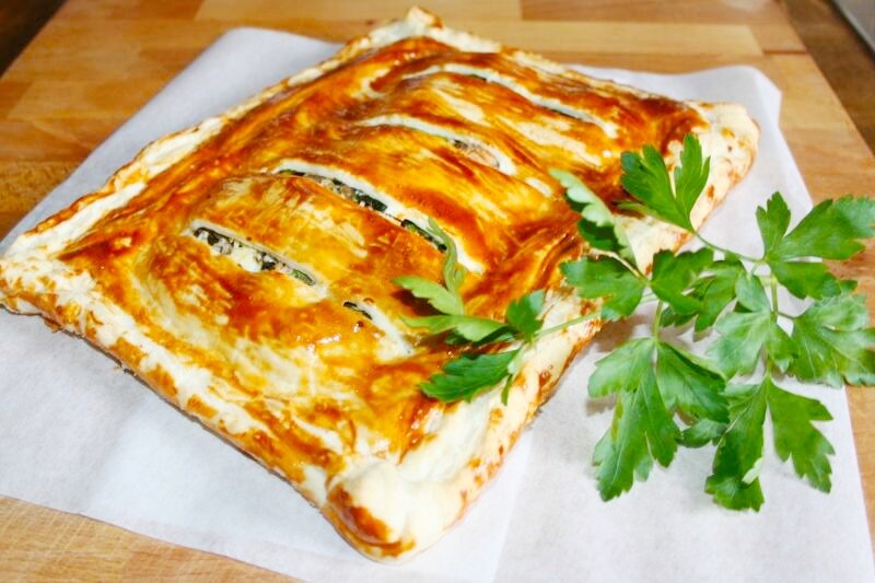 Обещаю, что будет очень вкусно. Приготовим пирог с лососем, использовав слоеное тесто. Это блюдо можно подавать на стол как горячим, так и в холодном виде. Расскажу подробнее. Ингредиенты: Филе лосося – 250 г Зеленый лук – 1-2 пучка Грибы – 150 г Свежий шпинат – 180 г Рис басмати – 50 г Яйца – 3 шт. 1/2 лимона, мелко тертая цедра Лимонный сок – 1 ч. л Свежий укроп или петрушка Слоеное тесто - 500 г Мука для раскатывания Крупно молотый перец Сливочное масло Соль Перец Способ приготовления: Смажьте фольгу сливочным маслом. Положите лосось на фольгу и сложите в пакет с плотно закрытыми краями, оставляя достаточно места внутри для циркуляции воздуха. Положить на противень и запекать 20 минут в разогретой духовке. Разогреть духовку до 200°C . Очистить, помыть и нарезать зеленый лук и грибы. Растопить половину сливочного масла в кастрюле, жарить лук и грибы на среднем огне до мягкости. Слейте собранную жидкость и дайте ей остыть. Разбейте лосось на крупные кусочки и смешайте с уже приг