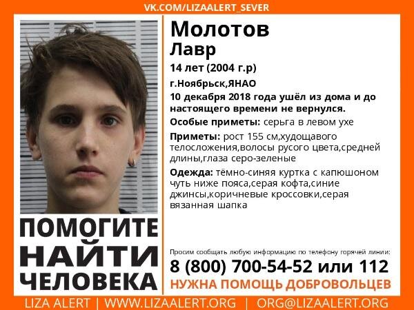 В Ноябрьске опять пропал четырнадцатилетний Лавр Молотов