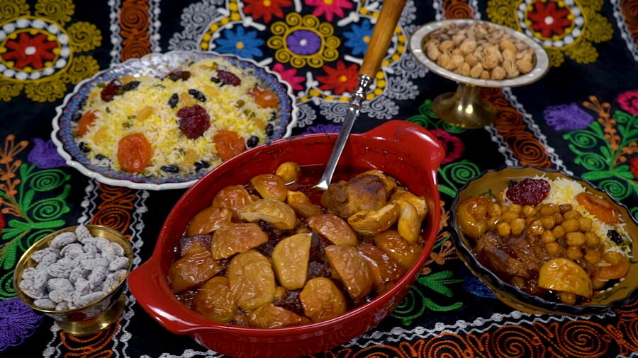 Сложилось мнение, что баранина должна быть непременно либо пряная, либо соленая, либо перченая. Но сегодня у нас в планах приготовить кисло-сладкую баранину. Обо всех секретах и нюансах этого процесса расскажет Сталик Ханкишиев. Ингредиенты: баранина, репчатый лук, томатная паста, соль, специи, яблоки, изюм, горох нут. Кладем в казан топленое масло и добавляем к нему немного растительного масла – буквально еще пару ложек. Разделываем мясо на большие куски. Масло нагрелось – опускаем мясо в казан. Мясо еще не готово, но уже равномерно обжарено со всех сторон – самое время добавить нарезанный лук. Нам понадобится примерно 0,5 кг. Убавляем огонь до минимума и накрываем казан крышкой. Через 25 минут снимаем крышку, прибавляем огонь и начинаем как следует перемешивать мясо и лук. Когда лук превращается в соус и становится все менее различимым, самое время добавить специи. Выбирайте то, что, по вашему мнению, будет уместно для кисло-сладкого соуса – сейчас самое время проявить ваши тво