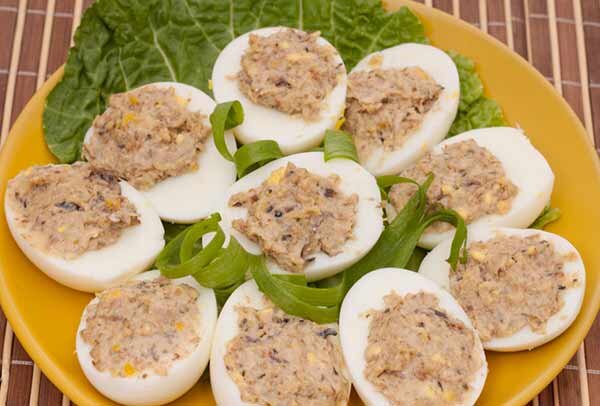 Предлагаю друзья очень простую в приготовлении закуску. Ингредиентов потребуется минимум, а приготовить сможет даже школьник. Вы можете приготовить её для себя любимых или на праздничный стол. Надеюсь ваши близкие останутся довольны. Блюдо готовится легко и просто, а получается очень вкусно. Что именно потребуется для его приготовления, смотрите ниже… Необходимые ингредиенты для закуски: · Яйца отварные вкрутую – три штуки; · Сардины консервированные в масле – одна банка; · Зелень (на выбор: лук, петрушка, укроп) – небольшой пучок; · Майонез – одна ч. ложка (лучше домашний). Способ приготовления закуски: 1. Итак, приступим! Берем варёные яйца, чистим от скорлупы и разрезаем вдоль. Если нет варёных яиц, то варим их в течение 8-10 минут в воде после закипания. 2. Затем из разрезанных яиц вынимаем желтки. 3. Далее открываем консервы. Вынимаем рыбу в какую-нибудь посудину и разминаем вилкой. 4. После этого добавляем к рыбе желтки и так же разминаем. 5. Потом добавляем майонез, порублен