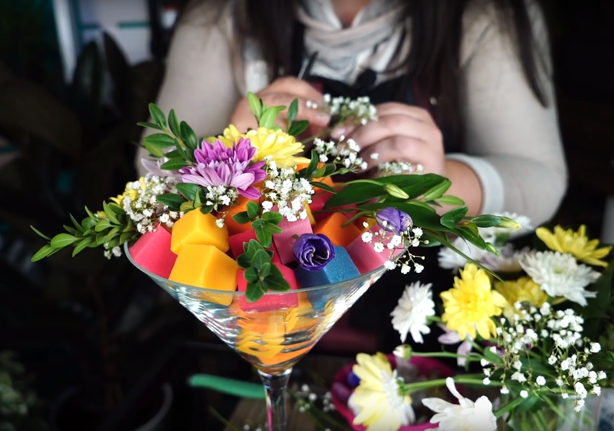 Если Вы хотите, чтобы цветочная композиция простояла как можно дольше, нужно научиться пользоваться флористической пеной. Это наиболее используемый материал при работе с живыми цветами. Работать с пеной очень удобно, она позволяет вставлять и удерживать стебли под нужным углом. Пена флористическая (оазис) продается разных размеров и различных форм (цилиндров, шаров, конусов и кирпичей). Блок пены, которую Вы купите, скорее всего не будет, того размера, который нужен для вашего контейнера. Просто вырежьте из блока ту форму и тот размер, который необходим, используя канцелярский или строительный нож. Флористическая пена режется очень легко, поэтому не придется прилагать больших усилий. Посмотреть ассортимент товаров для флористики Вы можете в нашем интернет-магазине garden-zoo.ru