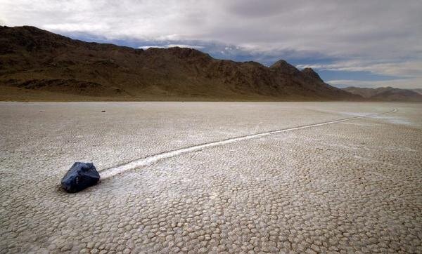 Известный в США Национальный парк – Долина Смерти, площадью 13,5 тыс. кв. км, но известен во всём мире своей уникальной особенностью, а конкретнее передвигающимися камнями, которые находятся на его территории. Сам Национальный парк представляет собой когда-то полностью высохшее озеро, дно которого сейчас покрыто глиной. Небольшое разнообразие в этот пейзаж придаёт скала, которая находится посередине озера. Любой человек, который впервые здесь появляется, сразу же замечает огромное количество «троп», одни из которых длиной всего несколько метров, а некоторые уходят на сотни метров вперёд. Зачастую все эти тропы идут ровной линией с севера на юг, но можно заметить и поворачивающиеся дорожки, которые пересекаются между собой. Всё бы ничего, если бы эти дороги не создавались обыкновенными камнями, причину движения которых не могут достоверно установить и по сегодняшний день. Множество людей и ученых пытались доказать свои теории передвижения камней по дну усохшего озера, кто-то придержи