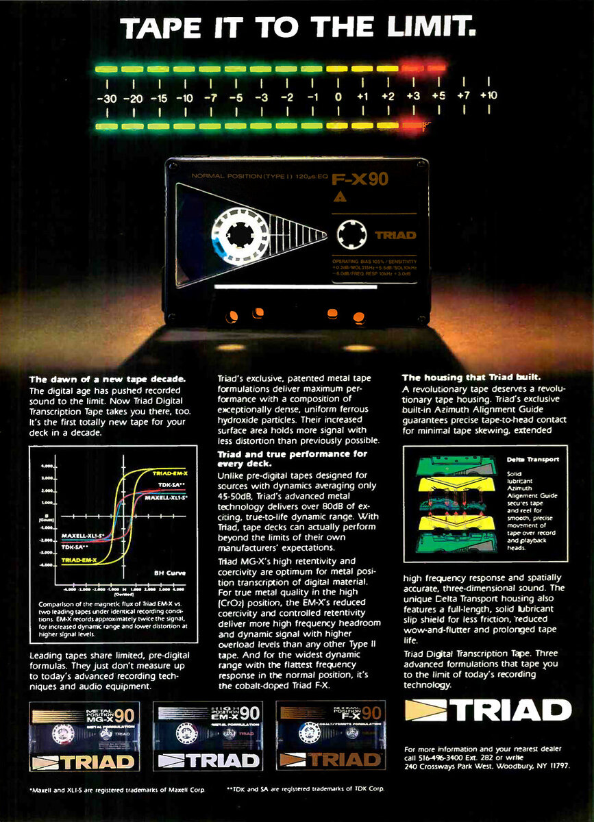 Эта кассета родом из 1986 года, когда ̶т̶р̶а̶в̶а̶ ̶б̶ы̶л̶а̶ ̶з̶е̶л̶е̶н̶е̶е̶ появились Roxette и распались The Police. DM выпустили Black Celebration, Metallica – Master Of Puppets, Genesis – Invisible Touch, а Queen – A Kind Of Magic. В это же самое время выпуском кассет Triad F-X занимался японский электрохимический гигант Taiyo Yuden, о котором я уже рассказывал здесь. Правильнее будет сказать, что кассета FX со своей особой лентой вышла в 1983 году, но только на внутреннем японском рынке и под маркой That's. А у нас в руках усовершенствованная версия 1986 года F-X, которая была выпущена для линейки кассет нового бренда Triad, созданного специально для покорения американского рынка. Корпус кассеты, так называемый Delta Transport, имеет большое треугольное окно. В таком корпусе было выпущено большинство кассет производства Taiyo Yuden. Он выполнен из пластика хорошего качества, но у некоторых топовых кассет, каких как That's CD-MH его делали из особой полимерной смолы, снижающей вибра