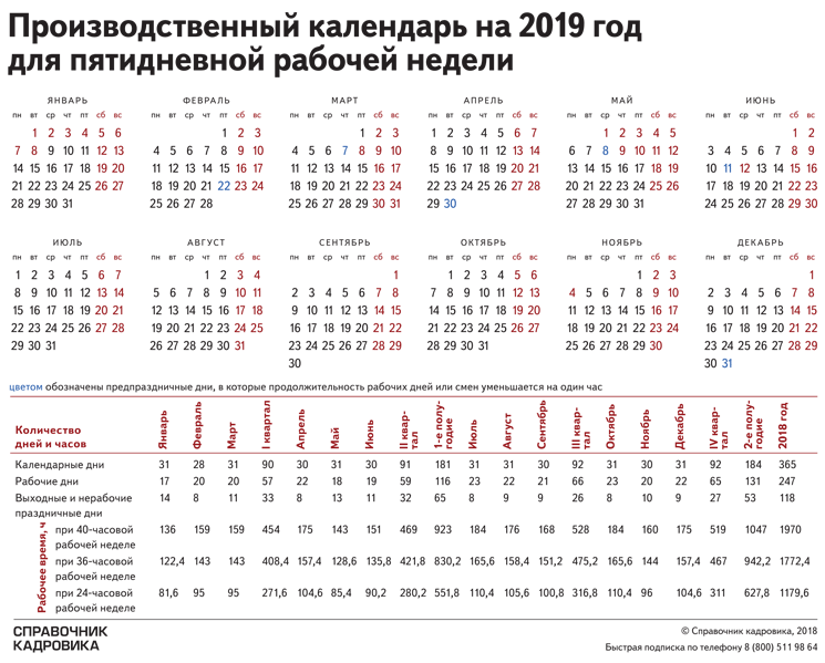 Нерабочие праздники, которые в 2019-м попадают на выходные дни, перенесут. Количество рабочих дней и часов в следующем году останется таким же, как в 2018-м. Но изменится число «длинных» выходных и дней, которые нужно сократить на один час. К тому же тем, кто трудится на пятидневке, не придется работать по субботам. Теперь можете строить планы на следующий рабочий год и даже запускать подготовку графика отпусков: Правительство утвердило перенос выходных и праздников в 2019-м, постановление от 01.10.2018 № 1163. Скачать календарь для пятидневной рабочей недели и для шестидневной рабочей недели в хорошем качестве, сможете в электронном журнале>>> Хотите первыми знать самые важные изменения в кадровой сфере? Ставьте палец вверх и подписывайтесь на наш канал "Pro-personal.ru" .