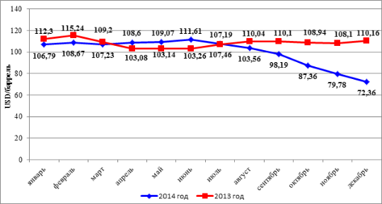 До июня 2014 года цены на нефть растут, однако начиная с июня происходит резкое снижение до 72,36 доллара за баррель. Данная цена является очень низкой.