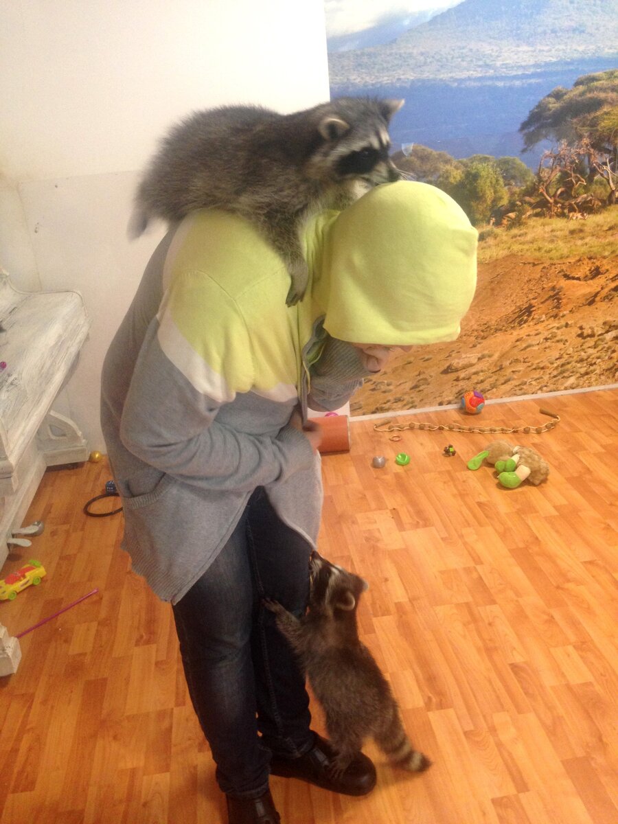 Вчера мне удалось исполнить одну свою мечту- поиграть с енотом) Да не с одним, а с пятью енотами. Одновременно. Непередаваемые эмоции! Суть в чем: ты приходишь к ребятам в дом, платишь условные 250р. в час- и еноты за эти деньги делают с тобой всё, что хотят. Они ползали по нам как по деревьям, искали еду у нас в волосах, делали "фыр-фыр" нам в уши, шмонали наши карманы на наличие там вкусностей. Плюс ко всему тебе дают корм, который эти полосатые жопки пытаются у тебя украсть. Вообще, стоит тебе взять в руки вкусняшки, как всё внимание всех п