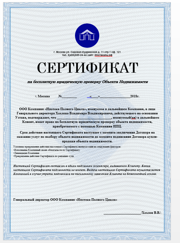 Дорогие друзья! Рады Вам сообщить, что все клиенты, заключившие договор на оказание услуг до Нового 2019 года, получают в подарок от Компании ИПЦ: • сертификат на бесплатную юридическую проверку объекта недвижимости • сертификат на гарантийное юридическое обслуживание в течение 3-х лет с момента купли-продажи. Оставьте заявку на обратный звонок для дополнительной информации о правилах акции и своих дополнительных возможностях. Оставьте заявку: Заявка