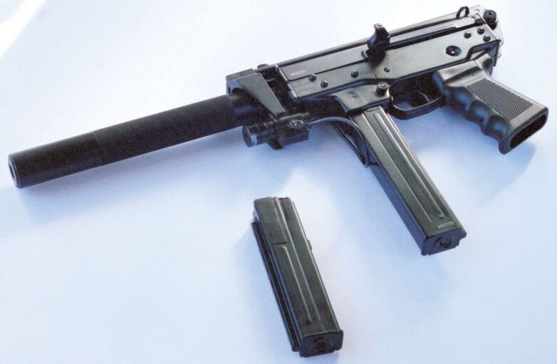 Из значительных плюсов особенно выделяют складной приклад, отсутствие выступающих частей на поверхности (что делает его удобными при ношении под одеждой), а также легкость и компактность. Укомплектован глушителем звуков, лазерным указателем цели и фонарем.