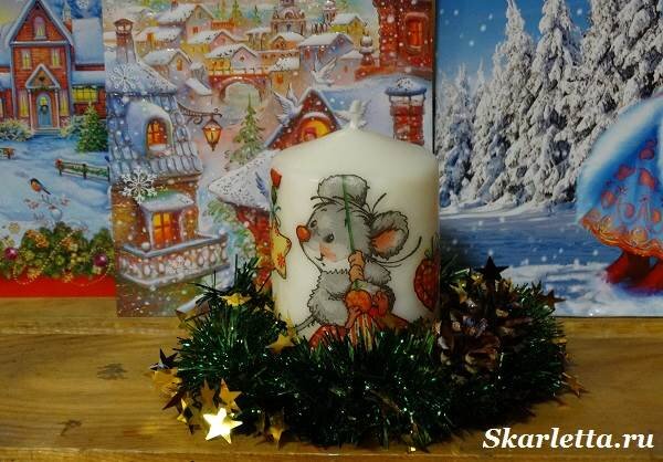 В преддверии одного из самых душевных праздников в году хочется ярких ощущений и ярких красок. Поэтому сегодня мы будем превращать обычную блеклую свечу в- новогоднюю в технике декупаж. Нам понадобится: 1. Свеча. Желательно выбирать большую свечу, чтобы было больше места для фантазии и рисунок получился виден и понятен. 2. Салфетка с желаемым рисунком. Салфетка подойдет обычная трех-двух слойная или можно использовать специальные салфтки для декупажа. 3. Свеча таблетка. 4. Металлическая ложка. 5. Ножницы. Теперь необходимо определить какую часть салфетки с понравившимся узором нужно вырезать. И вырезаем примерно представляя как расположим картинку на свече. Отделяем все нижние слои салфетки и приступаем непосредственно к декупажу свечи салфеткой. Перенос салфетки выполняется при помощи ложки, которую предварительно необходимо нагреть над маленькой свечей. Важно нагревать ложку вогнутой стороной вниз, так как при нагреве может образоваться нагар, который может попасть на рисунок, а при