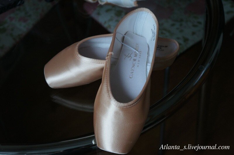 В профиль ножка в туфлях смотрится достаточно симпатично, но в анфас - становятся видны складочки. Зная как устроены туфли Большого, и из чего они сделаны, мне захотелось узнать из чего же делают балетную обувь в Америке. Кстати, у Geynor, на мой взгляд, есть два недостатка. В них тяжело вставать на полупальцы (всегда было интересно почему) и к пятке туфель надо пришивать резинку, чтобы пятка не соскакивала.