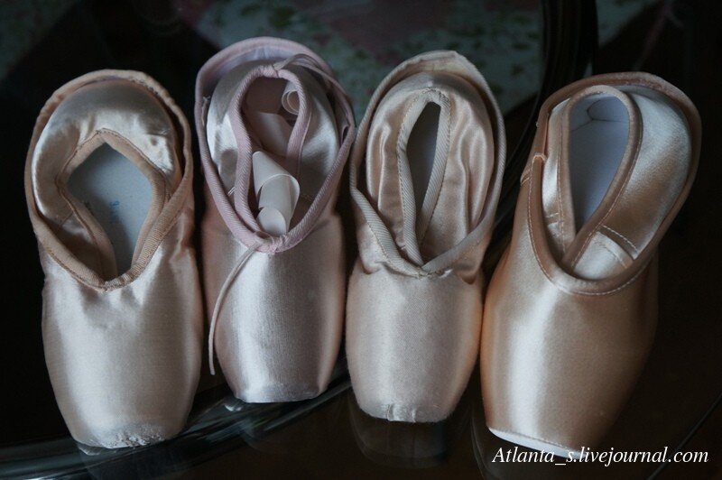 Итак, перед вами 4 пары "пальцев". Это - китайские SanSha, японские Chacott, туфли, изготовленные в мастерских Большого театра и американские Geynor Minden.