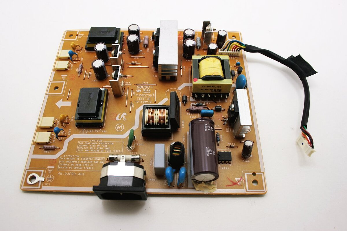 VT1 и VT2 - это биполярные транзисторы. Их задачей является поочередное открытие с частотой в десятки кГц. Еще одним важным компонентом является трансформатор Т2, который относится к категории импульсных силовых трансформаторов. Его функцией является обеспечение гальванической развязки от электросети. Найти этот компонент несложно, так как он хорошо виден на фоне других трансформаторов, которые расположены на пе