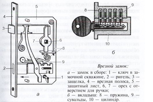 (Схема устройства врезного дверного замка.)