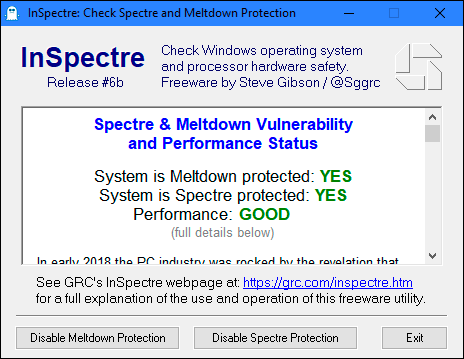 Запустите программу «InSpectre» и определите, защищена ли ваша система от уязвимостей «Meltdown» и «Spectre» или нет, и какие меры нужно предпринять для ее защиты. Если установленное обновление «BIOS» исправило ошибку, вы увидите сообщение, в котором говорится, что ваша система теперь защищена.