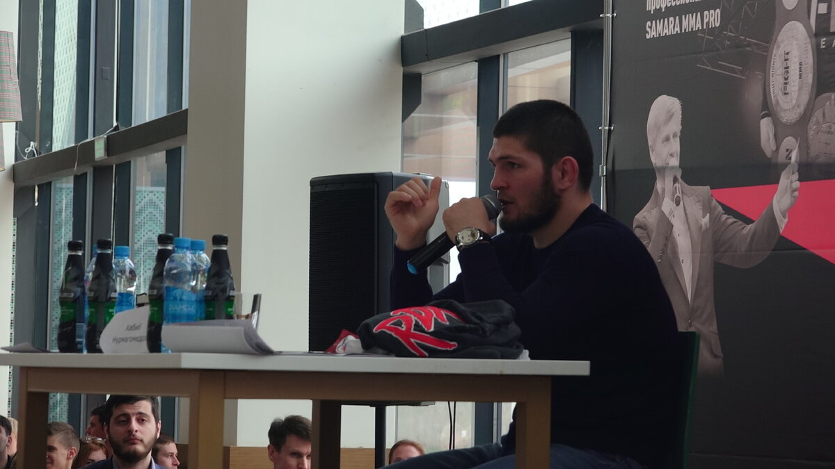 В четверг, 13 декабря, в Самару приехал Хабиб Нурмагомедов, действующий чемпион UFC в легком весе. "Непобедимый орел" в качестве почетного гостя посетит финал турнира по ММА "Битва на Волге", где будет бороться его двоюродный брат. Накануне турнира Нурмагомедов встретился с поклонниками в одном из самарских торговых центров и первым делом попросил передать микрофон в зал. Организаторы турнира "Битва на Волге" удачно совместили процедуру взвешивания бойцов перед поединками с пресс-конференцией Хабиба Нурмагомедова. Уже к 18:00 на фуд-корте одного из самарских торговых центров собрались сотни поклонников. Сам же Хабиб появился в зале спустя час. Как только боец вышел на сцену, фанаты хлынули к нему в прямом смысле: охранникам ничего не оставалось как в срочном порядке убрать ограждения. К слову, несмотря на это, никаких эксцессов не произошло. Публика вела себя вполне прилично. Первым делом Хабиб попросил отдать микрофон не журналистам, а в зал для того, чтобы пообщаться с гостя