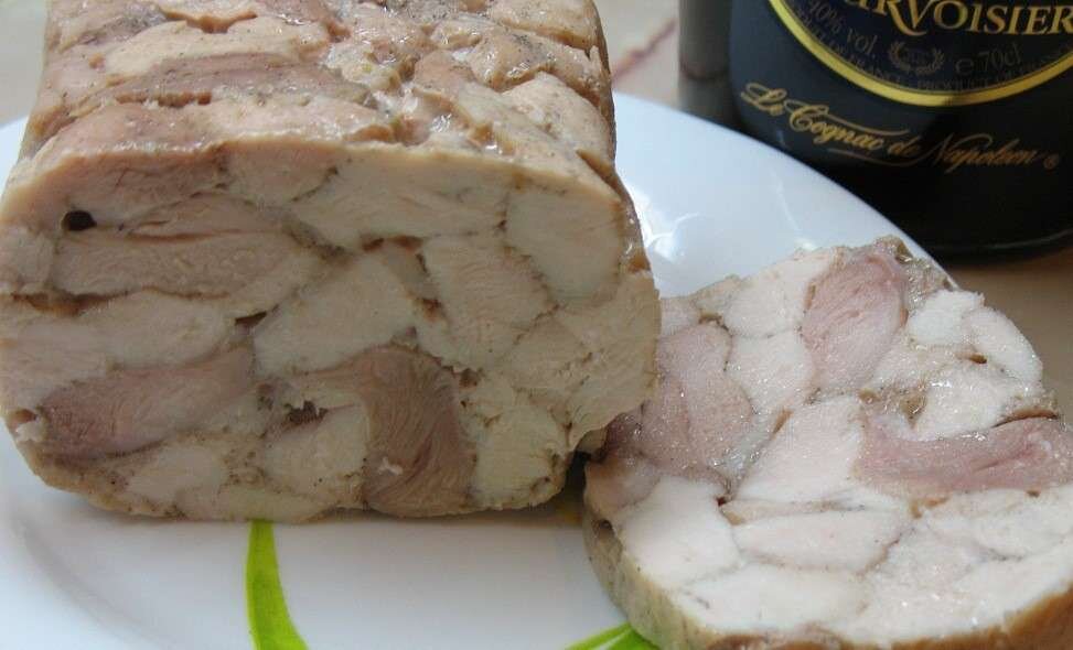 Ингредиенты: мясо куриное – 800 г; зубчики чеснока – 3 шт.; желатин – 10 г; соль – 1 ч. л.; специи – 1 ч. л. Способ приготовления: С курицы убрать лишний жир и пленки, промыть под проточной водой, нарезать поперек волокон (ветчина будет сочнее). Чеснок почистить и измельчить мелко ножом или при помощи чеснокодавки. Добавить измельченный чеснок, соль, специи к куриному мясу, Перемешать, посыпать желатином. Можно добавить немного куркумы, она придаст ветчине золотистый оттенок. Всё хорошенько перемешать и оставить при комнатной температуре на 30 минут. Заполнить мясной основой специальный пакет или рукав. Сформировать цилиндр, а сверху одеть жестяную банку или трубу. Завязать конец пакета. Уложить ветчину на противень и отправить в разогретую духовку до 200 градусов на 1 час, периодически переворачивая банку. Затем выключить духовку и оставить ветчину внутри остывающей духовки, затем вынуть из духовке и убрать вместе с банкой в холодильник на 2
