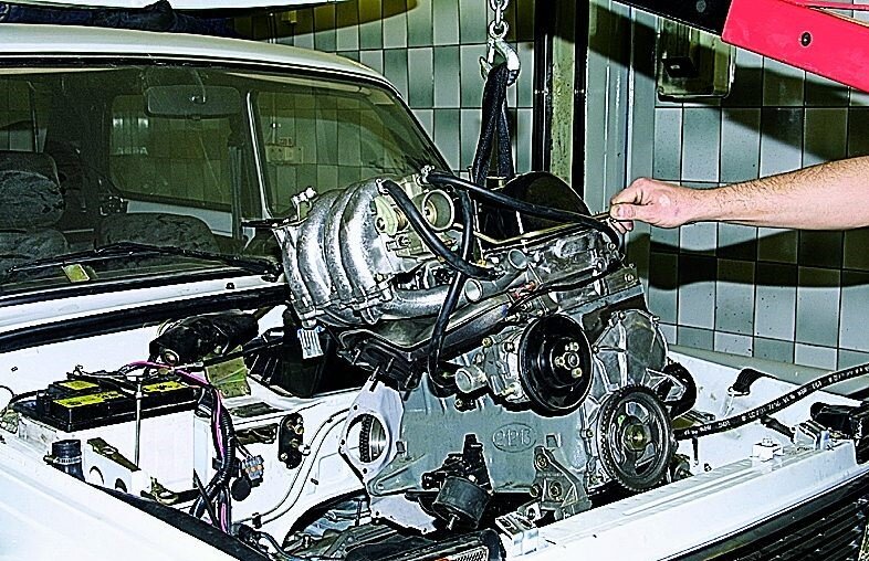 Снятие и установка двигателя на ваш автомобиль. Двигатель вынимается в верх, без коробки передач. Для извлечения двигателя нужен кран либо лебедка. Поскольку при этом разъединяются некоторые элементы на шасси, то для подъема автомобиля необходимо также стационарный подъемник или Гаражный домкрат. Перед монтажом двигателя всегда нужно прикрывать крылья. Демонтаж снятие двигателя отключить провод массы от аккумулятора Аккумулятор находится справа в нише под кожухом. В автомобилях с климатической установкой аккумулятор размещён под задним сиденьем. Снять верхний кожух радиатора. Слить охлаждающую жидкость отвернуть сзади на двигателе болты крепления трубки охлаждающей жидкости. Отключить провод массы от упора двигателя слева. Вынуть разъем регулятора нагрева двигателя. Отсоединить от двигателя верхний шланг охлаждающей жидкости. Отсоединить от крепления в бачок омывателя стекол и отложить в нишу под стеклом. Отключить сзади от блока двигателя шланг охлаждающей жидкости, ведущий к нагрева