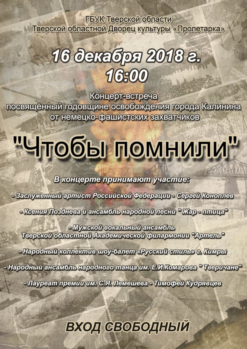 16 декабря в 16.00 народный самодеятельный коллектив «Жар-птица» (руководитель Ксения Позднева) Тверского областного Дворца культуры «Пролетарка» совместно с мужским вокальным ансамблем «АРТэЛЬ» Тверской Академичекой Областной Филармонии (руководитель Сергей Левин) приглашают гостей на вокально-хореографический творческий вечер «Чтобы помнили…», посвященный Дню освобождения Калинина от немецко - фашистских захватчиков. В концертной программе также принимают участие народный ансамбль танца «Тверичане» им. Е.И.Комарова (руководитель Наталья Загороднюк) и народный коллектив шоу-балет «Русский стиль» Кимрского района (руководитель Елена Савченко). В оригинальной авторской аранжировке Ксении Поздневой и Сергея Левина с Большой сцены прозвучат незабываемые мелодии военных лет, такие как «Смуглянка», «Катюша», «На горе, на гороньке», «За тихой рекою», «Провожала я дружка» и другие. История каждого из этих произведений будет дополнена русскими народными танцами, а также стихот