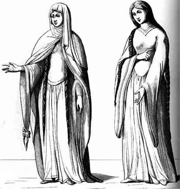 Женщины носили только блио - глухие, закрытые туники, скрывавшие даже ноги. Овальные боковые разрезы на платье шнуровались лентами для облегания груди и талии.