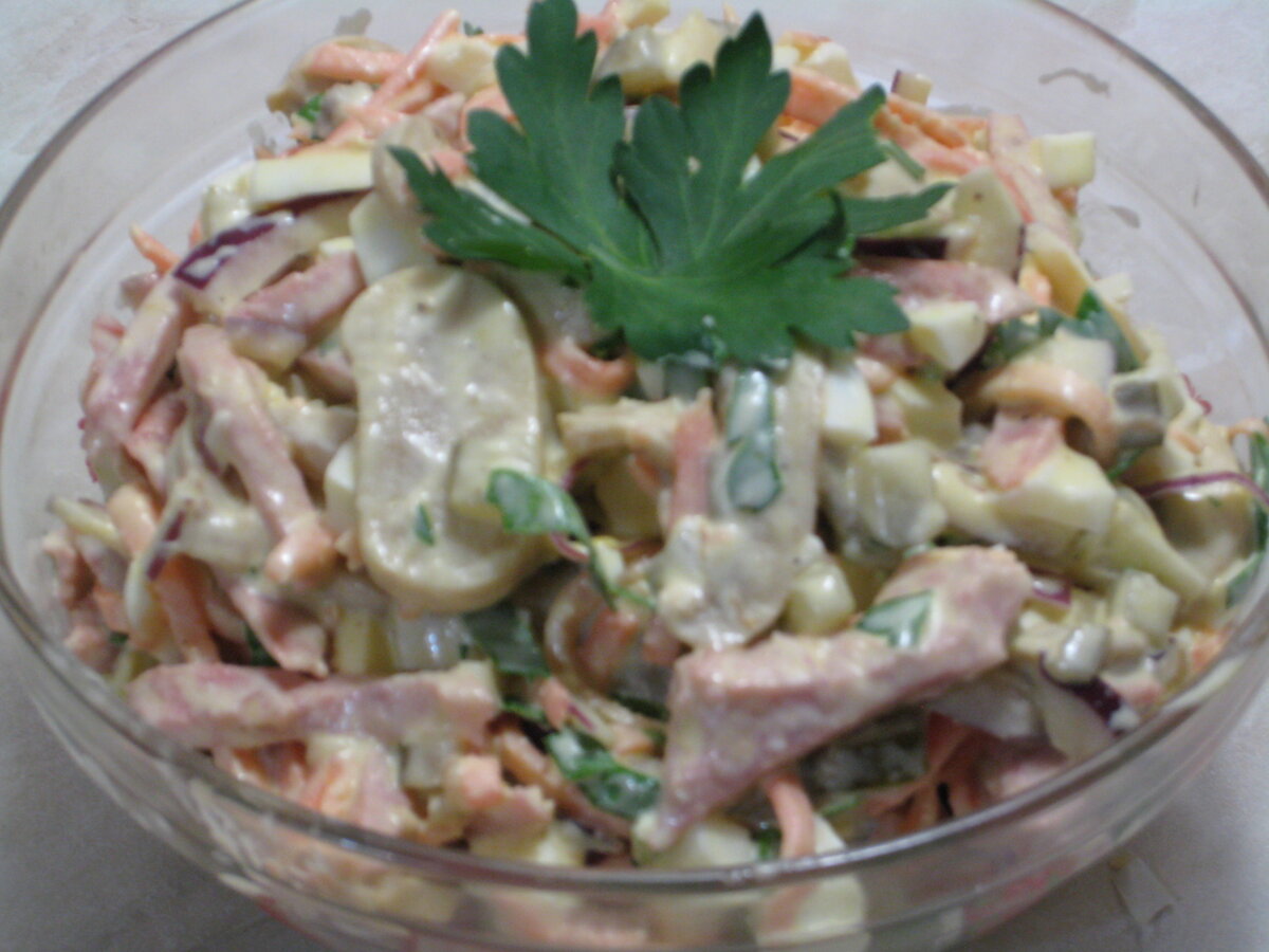 Грибной салат с колбасой и маринованным огурцом. Пошаговый рецепт с фото.