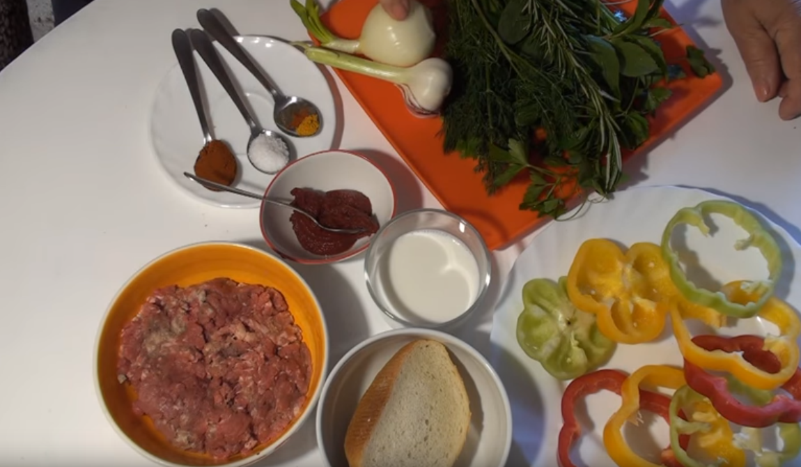 Здравствуйте, готовим сегодня котлеты в овощах, как? Давайте посмотрим как же это готовится. Ну начнём конечно же с фарша. У нас фарш домашний, батон, молоко, томатная паста, приправа какую вы любите, чеснок и лук. Из овощей перец трёх цветов и зелень. Розмарин, мята - это для аромата и укроп петрушка - это для вкуса. Батон замачиваем молоком, В томатную пасту добавляем, все наши специи, из специи у меня паприка, соль, куркума, красный острый перец и черный перец в общей сложности пять приправ и хорошенько всё перемешиваем. Разводим водичкой после того как всё разойдется оставим в сторону. Нарежем лук, зелень, чуть-чуть розмарина, если у вас нет розмарина можете не добавлять. Теперь нарезанный лук, пару долек чеснока и зелень всё загружаем в блендер и немножечко пробиваем. И добавляем в блендер фарш, батон размоченный в молоке и томатную пасту со специями. Если у вас нет блендера, можно пропустить все это через мясорубку. Теперь нам нужен противень для духовки, у меня силико