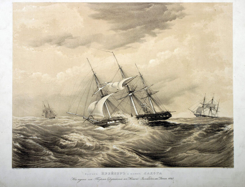 В дальние плавания и экспедиции всегда на борт корабля брались зоологи-художники и прочие естествоиспытатели. Вот мы и видим рисунок одного из них в дальнем плавании. Погода штормовая , но разгул стихии не очень жестокий.
