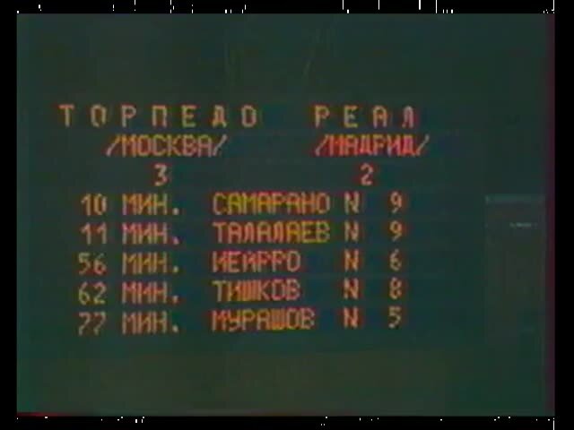 От того матча остались редкие кадры телевизионной картинки, да вот этот снимок табло, запечатлевший историческое событие с неправильно написанной фамилией капитана "королевского клуба" Фернандо Йерро. Этим летом он снова проиграл в Москве, уже во главе своей национальной сборной.