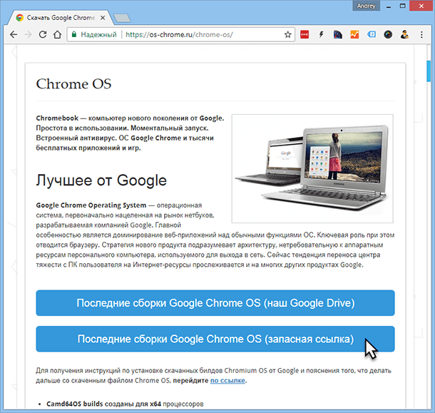 Чтобы скачать «Chromium OS» перейдите на веб-сайт «https://www.chromium.org/chromium-os» или скачайте установочный образ из «https://os-chrome.ru/chrome-os/».