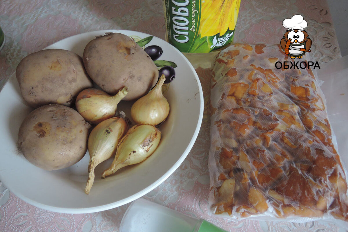 Итак, все что у меня имеется, это пласт замороженных грибочков, картофель (возьмите количество на ваше усмотрение), белый лук, подсолнечное масло, соль. Сковородку отправляю на сильный огонь, кладу туда грибы, накрываю крышкой. Пока грибочки размораживаются и обжариваются, а это займет около 10 минут, очищаю и нарезаю картошку кубиками, замачиваю ее в холодной воде. Лисички отошли, теперь я могу добавить подсолнечное масло. Лишняя вода выпарилась, мне остается их только обжарить. Нарезаю лук. Обжариваю на подсолнечном масле до золотистого цвета примерно минут 7. Можно добавить немного сливочного. К грибочкам отправляю картошечку. Если вода выпарилась, добавляю