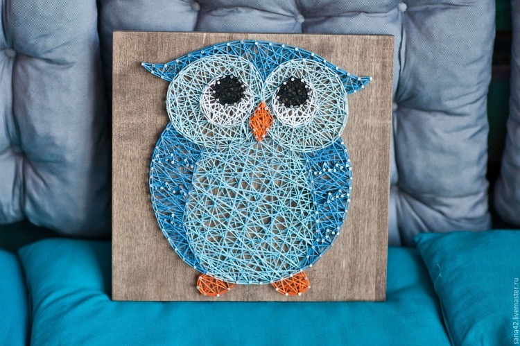 Кусок доски или фанеры подходящего размера; Бумажный шаблон желаемого изображения; Толстые нити (мулине или пряжа); Тонкие гвоздики; Малярный скотч;молоток. Вначале подготовьте основу для работы. Дерево или фанеру при необходимости нужно отшлифовать наждачной бумагой, можно их покрасить или покрыть лаком. Заранее подготовьте на бумаге шаблон рисунка. Зафиксируйте его на основе малярным скотчем и по контуру забейте гвозди с одинаковым интервалом. Их высота должна быть одинаковой — не забывайте это контролировать. Удалите бумажное лекало. Теперь настал самый творческий этап работы — обматывание гвоздей нитями. К одному из гвоздиков привяжите кончик нити и отрежьте хвостик. Начинайте в произвольном порядке обматывать гвоздики нитями, между ними должны получаться острые углы — постоянно меняйте направление и постарайтесь хотя бы по разу захватить каждый гвоздь. В конце работы привяжите нитку к одному из гвоздей и отрежьте хвостик. Поделка наших подписчиком у вас может тоже точно также есл