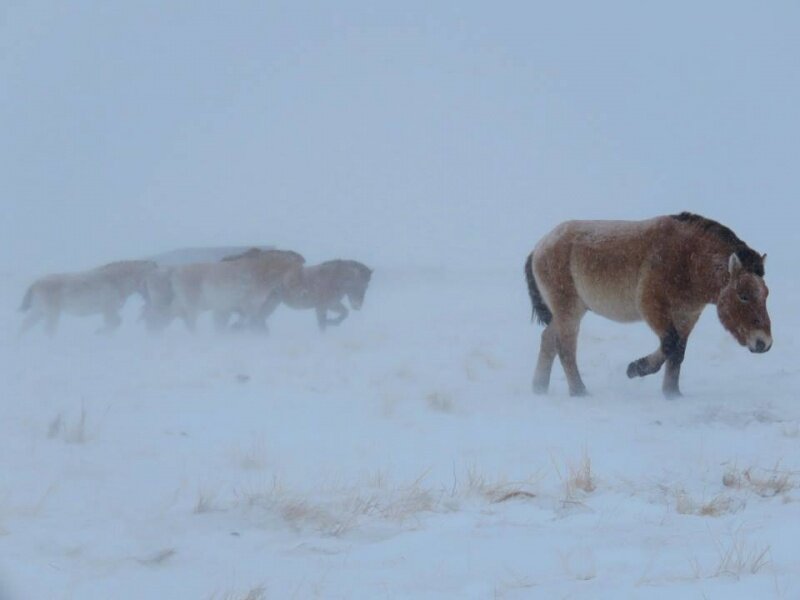 Дмитрий Немальцев, участковый государственный инспектор Оренбургского заповедника, о непогоде в степи: "Буран пришел в степь. Настоящий, оренбургский. Не дай Бог в такую круговерть заблудиться. Мы же с утра решили на всякий случай завезти в акклиматизационные загоны несколько рулонов сена. А москвичка Наташа, как шпиён, ползала вокруг пржеваликов с фотоаппаратом и радовалась драматизму картинок. Лошади драматизма, видимо, не ощущали, тебеневали себе травку, а Натаха чуть пальцы не отморозила".