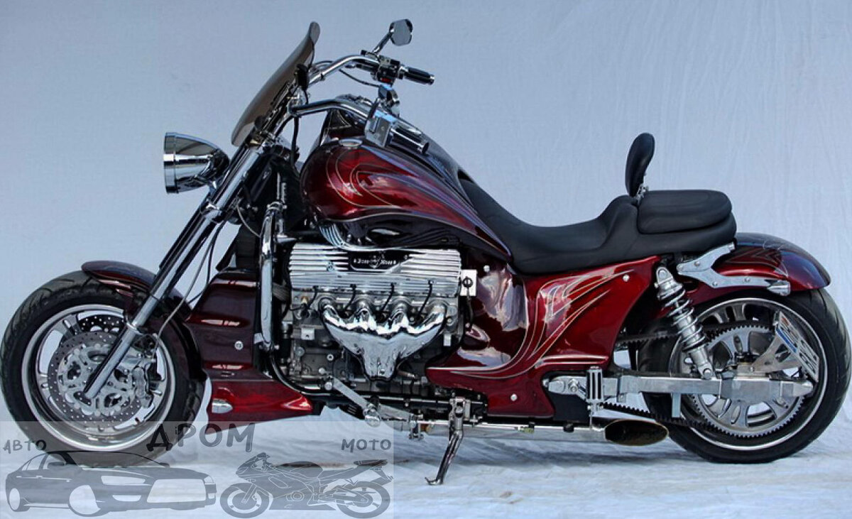 Доброго дня! Продолжаем тему мотоциклов с двигателями от автомобилей. В первой части мы рассмотрели два мотоцикла "прошлых лет" из этого списка. Из этого материала узнаем о самых настоящих монстрах в мире мотоциклов! Это необычные мотоциклы с двигателями от авто. Часть 2. Вперёд! Ближе к монстрам Boss Hoss Cycles Эта американская компания выпускала мотоциклы начиная с 1990 года. Самая главная особенность этих байков - могучие моторы от автомобилей. Не просто от автомобилей, а от довольно мощных и объемных! Boss Hoss устанавливали на свои мотоциклы моторы от автомобилей в духе Chevrolet Camaro, Chevrolet Corvette и подобных, то есть это V-образные "сердца" на 8 цинидров! Boss Hoss 5.7 & 8.2 У этого мотоцикла было 2 вариации выпуска. Так называемый Small Block - "маленький блок" в переводе. Да, у них он считается МАЛЕНЬКИЙ, учитывая что есть версия Big Block с объемом двигателя 8.2 литра! В наше время таких моторов на машинах почти не встретишь. Версия 5.7 имеет мощность 400 лошадиных си
