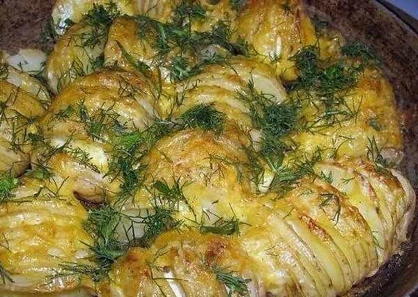 Предлагаю друзья рецепт картофеля с сыром. Здесь основным ингредиентом выступает картофель, а сыр используется для усиления вкуса. Поскольку картошка нарезается пластинами, но прорезается не до конца, она чем-то напоминает детскую гармошку. Ингредиентов для её приготовления Вам потребуется совсем немного, а блюдо получается очень вкусное. Кстати, и готовится оно достаточно просто. Рекомендую, обязательно попробуйте. Что вам потребуется для приготовления этого блюда, смотрите ниже... Необходимые ингредиенты для блюда: · Картошка – один кило (размер клубней средний); · Масло сливочное – 50 гр.; · Сыр твердых сортов – 100 гр.; · Сухари панировочные – одна ст. ложка. Способ приготовления: 1. Итак, для начала моем и чистим картофель. 2. Далее его нарезаем типа веером, т. е. до конца не дорезаем. 3. Затем берем противень, смазываем его маслом и выкладываем на него порезанную картошку. 4. После этого картошку перчим, солим и на каждый клубень выкладываем сверху по кусочку масла. 5. А тепе