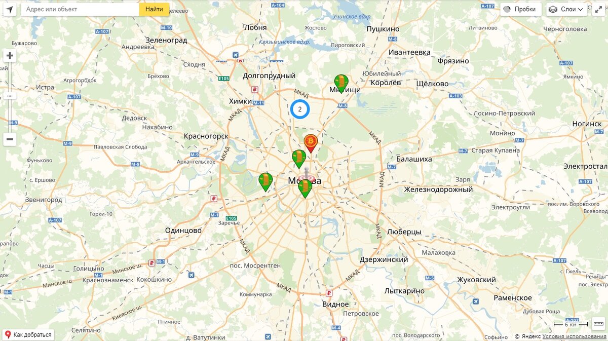 Сейчас Cryptocoinmap показывает несколько точек в российской столице, где криптоэнтузиасты могут обменять фиат на криптовалюту. В шести терминалах жители и гости столицы могут купить криптовалюту, а в одном – делать обмен в двух направлениях. Веб-сайт предоставляет информацию с адресами, телефонами и часами работы, а также фотографию месторасположения АТМ.