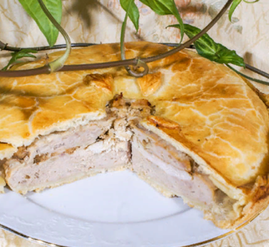 Немецкий песочный пирог с начинкой из нежного мясного паштета с прослойками куриного мяса и сочным желе