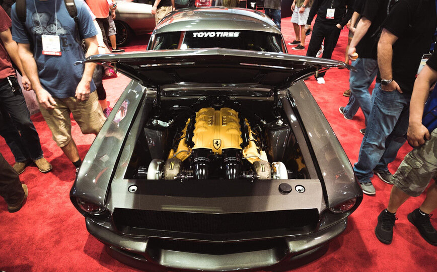 Форд Мустанг 1968 года с двигателем от суперкара Феррари F430 — этот крутой проект, который называется Coruptt, представила автомастерская American Legend из США на авто выставке SEMA 2018. Фишка этого проекта скрывается под капотом, где вместо стокового двигателя разместилась V-образная восьмёрка от суперкара Ferrari F430 с двумя турбонагнетателями Nelson Racing и впускным коллектором от модели Ferrari California. Кузов автомобиля претерпел большое количество изменений: крыша стала ниже на 6,5 сантиметров, передний бампер, сделанный с помощью 3D печати, получил воздухозаборники.