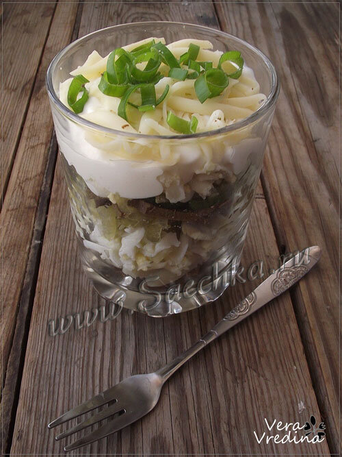 - Последним слоем майонез.