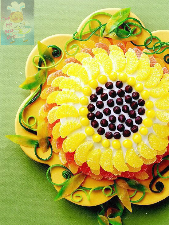 Думала, как удивить деток на дне рождения и решила оформить тортик в виде подсолнуха. Смешиваем и взбиваем ингредиенты для теста. 3 яйца сахар - 200 гр сметана - 200 гр мука - 3 ст разрыхлитель ванилин- 1 ч. л Смазываем сливочным маслом форму для выпекания, выливаем тесто и выпекаем 40 минут при 180 градусах. Даем остыть нашему бисквиту. Затем разрезаем на несколько коржей. Готовим крем. Топим пачку сливочного масла, смешиваем с банкой сметаны, стаканом сахара. Обмазываем коржи, Украшаем сверху разноцветным мармеладом и шоколадными шариками. Подписывайтесь на канал, готовьте по моим рецептам и пишите отзывы.