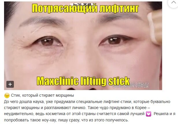 Корейская косметика сегодня у меня - тема дня! Подруга прислала ссылку на уникальный стик, который разглаживает морщины за несколько секунд. На бегу ответила ей, в свойственной мне, манере: "Чо за хрень?", но подруга не успокоилась и перезвонила с вопросом, посмотрела ли я видео и что я по этому поводу думаю. Пришлось мне заставить себя посмотреть видеоролик, чтобы высказать своё экспертное мнение. Вот скриншот шедевра: Знатоки графических редакторов поймут, почему я подвергла остракизму это "ценное предложение". Кстати, и происхождение корейского стика у меня вызывает сомнения. Но даже не это главное. Продавцы делают акцент на мало кому известные коллаген и пептид, утверждая, что именно эти вещества (вкупе с ядом паука) выравнивают рельеф лица, буквально, на глазах. Дорогие мои! Неправда! Никогда не верьте рекламе и не читайте по утрам газет! (С) Ни коллаген, ни яд паука не способны избавить вас от морщин за столь короткое время! Давайте рассмотрим подробнее. Коллаген - это вещество,