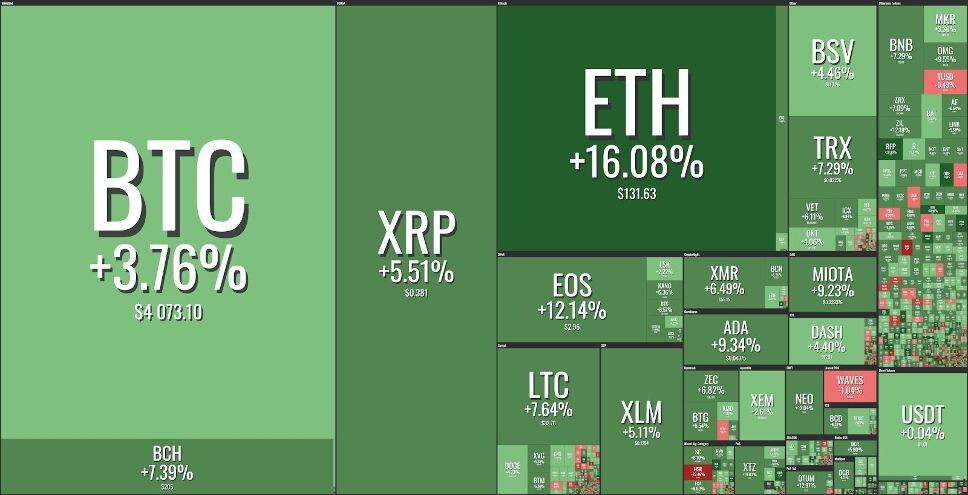 Платформа Trader trends (tt.ff.ru) – сервис решений для трейдеров и держателей криптоактивов. Подключайся и следи за портфелями профессиональных трейдеров. Воскресенье, 23 декабря: все топ-20 криптовалюты фиксируют умеренную прибыль, а цена биткоина (BTC) снова превышает $4000 согласно данным CoinMarketCap. На момент написания статьи биткоин вырос почти на 4% за день и теперь торгуется на уровне $4050. На недельном графике текущая цена ниже пятничного максимума почти в $4200, но все же криптовалюта по-прежнему торгуется значительно выше уровня $3294, с которой начала неделю. Ripple (XRP), вторая по рыночной капитализации криптовалюта, выросла более чем на 5% за день и теперь торгуется на уровне $0,374. Текущая стоимость монеты значительно выше уровня $0,292, с которого XRP начала неделю, но намного ниже максимума среды на $0,389. Ethereum (ETH) остается третьей по рыночной капитализации криптовалютой