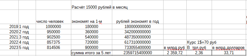 Знаете, вроде шум по поводу пенсионной реформы сошёл на нет, а ведь осталась 1 неделя до 2019 года, ну я и решил посчитать сам сколько же государство сэкономит на пенсионерах заставив их уходить сначала на 1 год позже, потом на 2 года позже и так и далее ..на 5 лет позже. Для того чтобы узнать сколько пенсионеров в стране я использовал данные из статдата.ру. Согласно им в стране если прибавить сейчас всех граждан старше 60 лет будет:30477 тысяч человек. Для того чтобы узнать сколько человек в нашей стране должно было выходить в следующем 2019 году я поступил очень просто. Всего в стране 15 миллионов школьников, делим на 11 лет получаем в год сколько человек =1 миллион 360 тыс человек. Пусть случится невероятное и из этих 1,36 млн человек до 60 лет доживут миллион человек. Вот этот миллион и возьмём за базу наших будущих пенсионеров. На каждый год допустим из этого миллиона 5% будет уходить ежегодно в мир иной. Далее пусть из этого миллиона пенсия средняя будет 15 тыс рублей. Давайте по